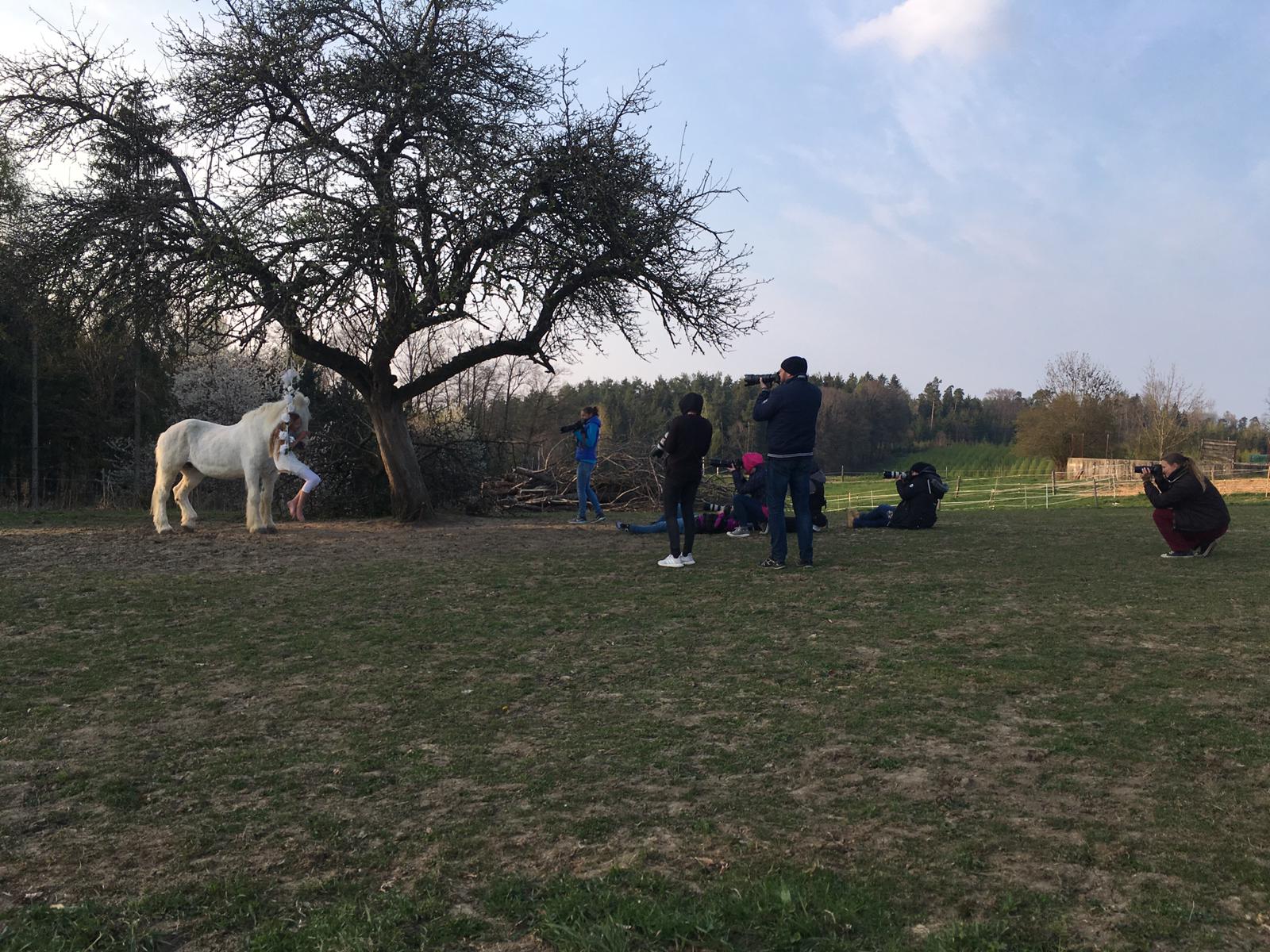 Zurück auf dem Hof, wurden Kiara, Lielan und ein Animierpferd auf die Koppel für Freilaufbilder gelassen. Freilauf bedeutet in dieser Jahreszeit auf einer frischen Koppel vorallem viel Laufarbeit für die fleißigen Helfer. Auch hier ein großes DANKE an Tanja, Daria und Andrea für die Laufeinlagen. Nach ein paar Runden Galopp wurde auch diese Gruppe in den verdienten Feierabend entlassen.