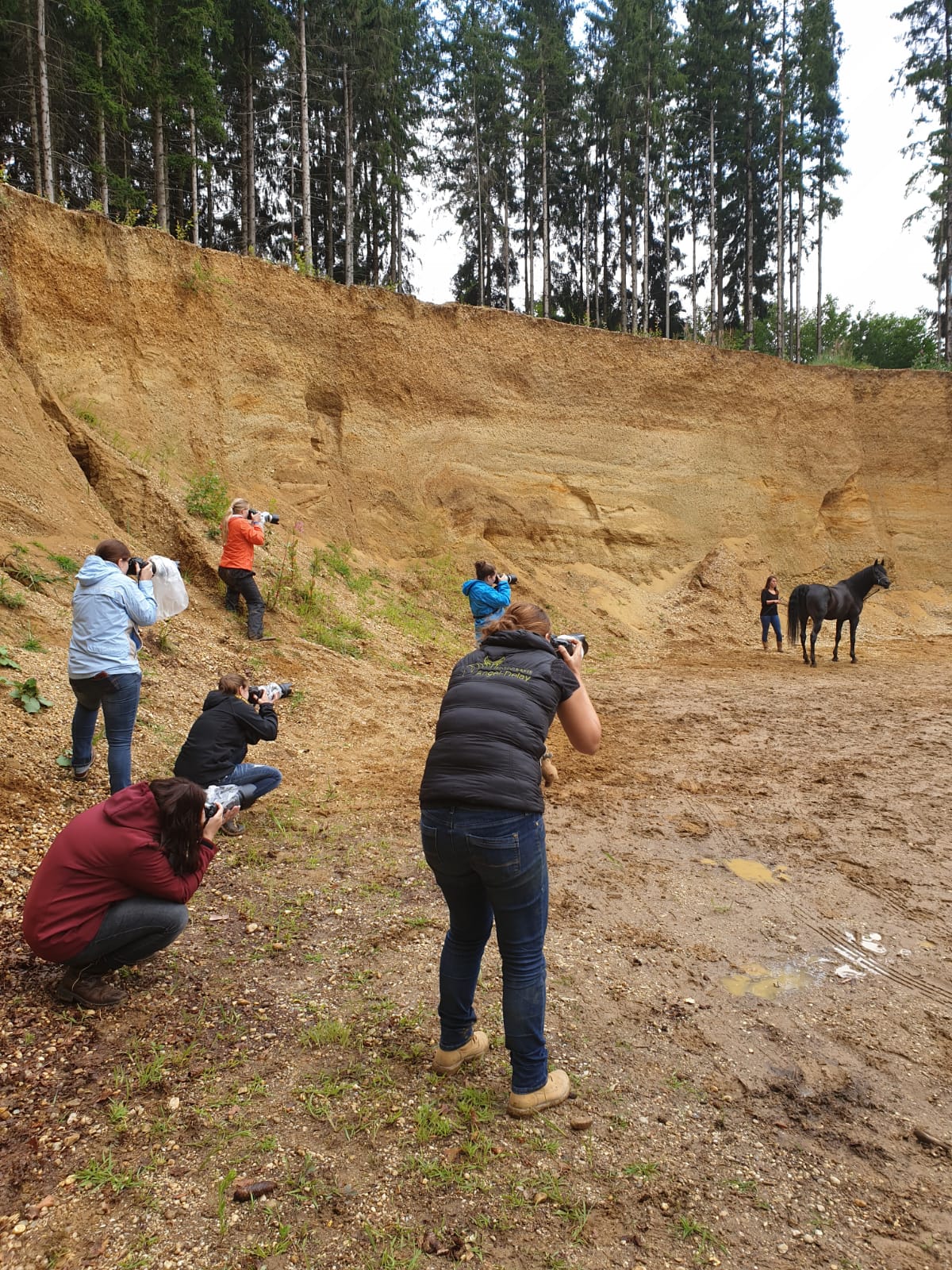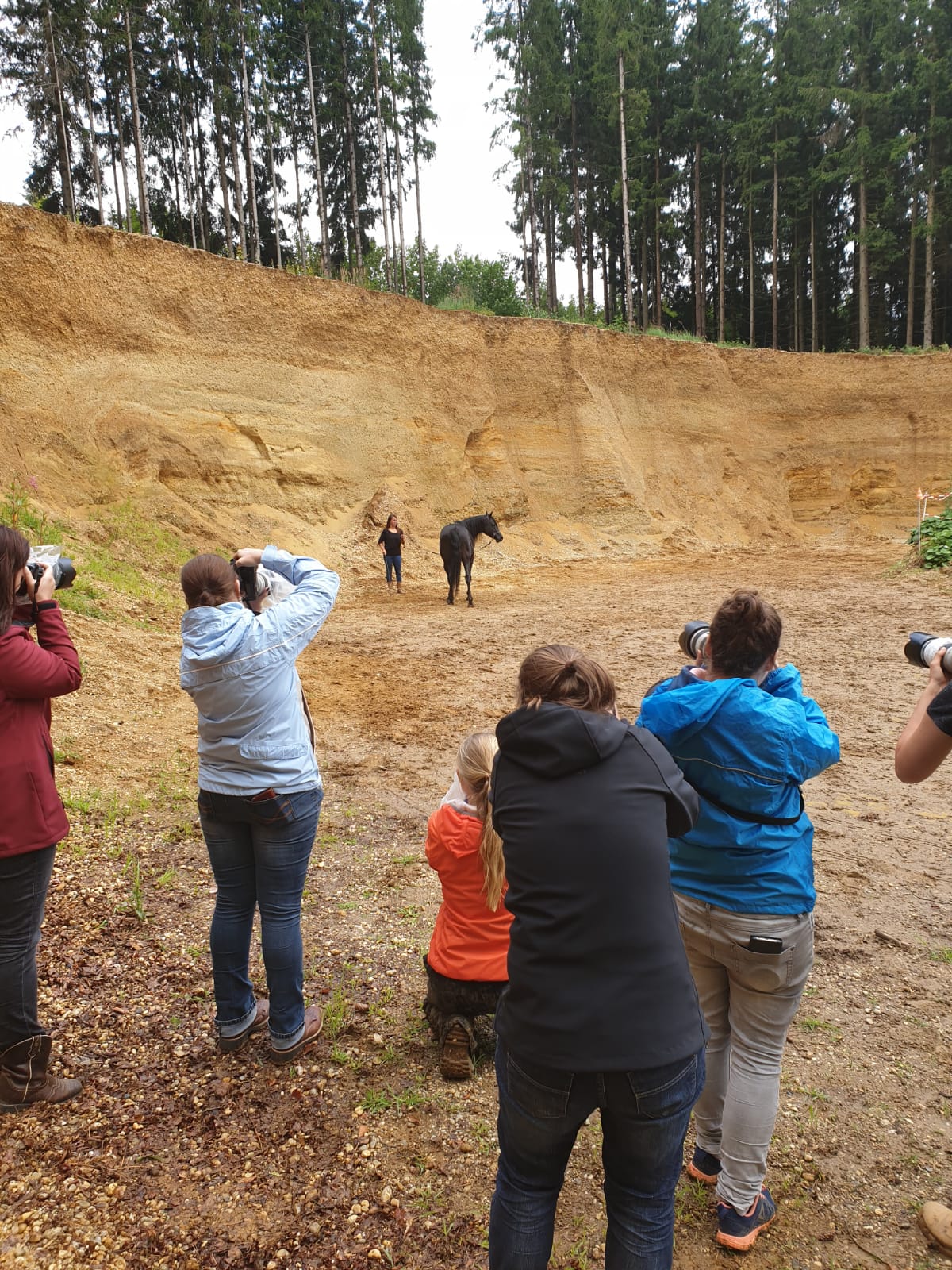 Auch die liebe Mona warf sich für uns noch in Schale und modelte zusammen mit ihrer Sharina für uns. Ein ebensolches Naturtalent wie ihre Pferde, danke Mona! Nachdem uns die Portraits genug waren, durften sich die Beiden noch zusammen auspowern und so galoppierten sie mit voller Freude in der Sandgrube auf und ab. Bis hierhin hielt auch das Wetter noch erstaunlich gut her. Der Wetterbericht sagte den ganzen Tag Regen voraus, weshalb ich für uns auch extra einen großen Pavillion und Biertische aufgebaut hatte, damit wir es trocken haben und vorallem unser Equipement trocken bleibt! 🙂